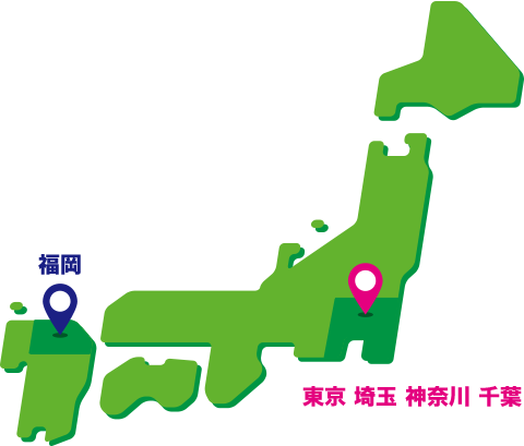 東京・埼玉・神奈川・千葉などの関東地方の他、福岡県も対応しております。即日対応を心がけて活躍しておりますが、エリアによっては難しい場合もございますので、まずはご相談のご連絡お待ちしております。