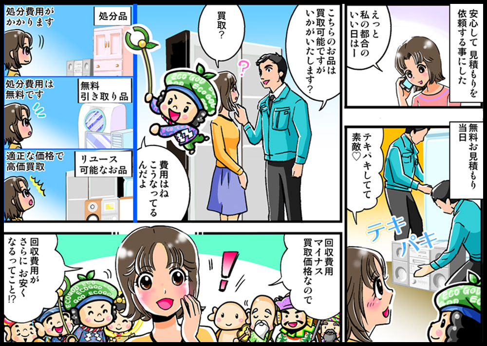 いらなくなった家電製品や子供のおもちゃ、ベビーベッドなどがたくさんあり片付けたくても自分たちで捨てるのはめんどくさい事を理由にクローゼットにずっと放置していました。片付けてもらいたく色々な業者さんにお電話をしました!その中で一番丁寧で親切に対応してくださったのがエコレンジャーさんでした!ありがとうございました!!やっと片付けられました笑